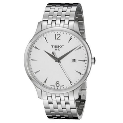 这款天梭传统系列瑞士石英男表为2014年款,属天梭Tradition传统系列,外观更为经典传统,减化了表圈设计,使表盘看起来更大,不落俗套。采用精准瑞士石英机芯,防眩蓝宝石水晶表镜,银色表盘,3点处日历显示,12、6阿拉伯数字标时,灰色表针;精钢表壳和表链,表壳直径42毫米,防水30米。设计传统简约,优雅大气!瑞士制造。