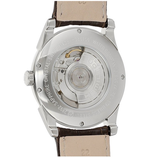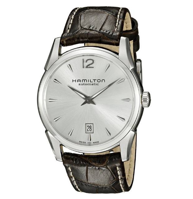 汉密尔顿Hamilton Men's H38515555 Jazzmaster Stainless Steel Automatic Watch with Brown Leather Band 爵士大师瑞士自动机械男表,此款男士腕表属于美式经典的爵士系列,延续了爵士系列的经典造型,外观典雅而大气。白色表盘无秒针的设计非常特别,日期窗口更是放到了六点位置。采用经典的瑞士自动上链ETA2892机芯,防划防眩蓝宝石水晶表镜,不锈钢表壳,表壳直径40mm,银色表盘配银色小时及分针,再加上棕色小牛皮表带,防水50米,可以戴着游泳。整体设计华丽低调,简约大气,无可挑剔,非常棒的一款机械腕表!