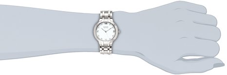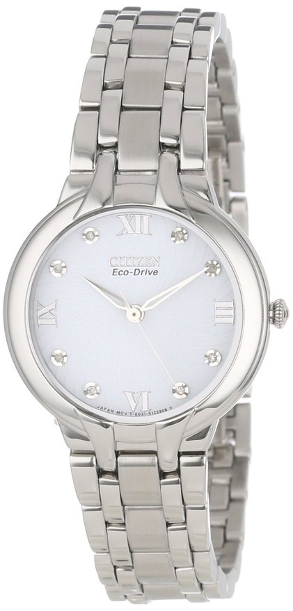 这款 CITIZEN 西铁城 EM0130-54A 镶钻光动能女表,采用波纹浮雕表盘,表盘上镶有八个天然真钻时标,时尚抢眼,奢华但不俗气,内置Eco-Drive光动能机芯,确保了时间的精准,吸收日常可见光作为能量来源,节能环保,终身无需更换电池,省心省力。不锈钢表壳表带,表盘直径29mm,厚度8mm,防水30米,足够应付日常生活,造型简约有致,高贵典雅,出席正装场合也是很合适的。