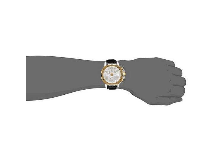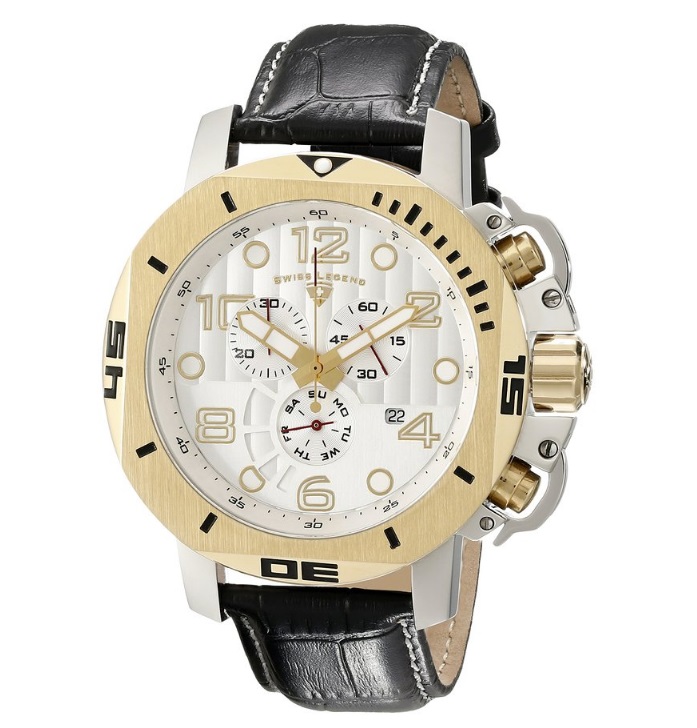 瑞士传奇Swiss Legend Men's 10538-02S-GB Scubador Chronograph Black Leather Watch 男士黑色皮带手表,SWISS LEGEND瑞士传奇是一个与众不同的品牌,它是动态的、现代的、活生生的。他的设计理念的核心部分在于我们和谐地平衡尖端技术与传统精准的时尚、独特的钟表风格承诺。如同展示给我们看的这款手表一样,黑色表带,搭配金色表壳,复古化的外圈分针刻度,白色表盘搭配古金色指针刻度,以及3眼计时,看似杂乱的表盘设计,其实暗藏规律,4点处有日期功能,100米防水,可以戴着游泳之类,防水能力比较强大!