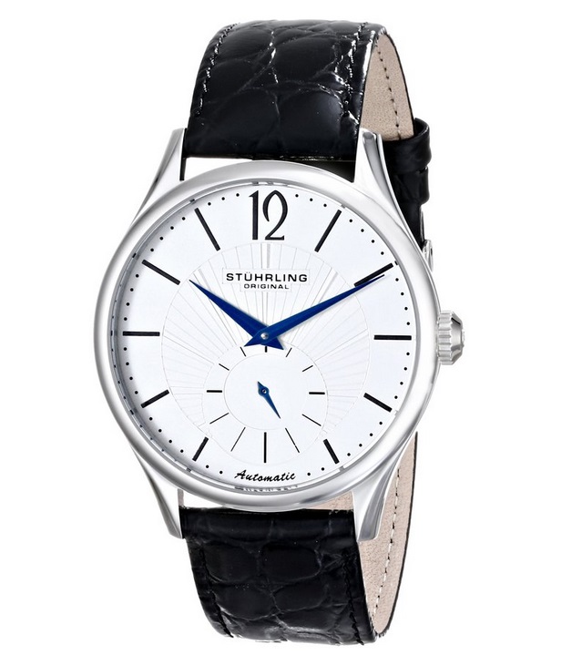 斯图灵Stuhrling Original Men's 171C.33152 Cuvette Automatic Silver Dial Watch 男士自动机械简约时尚手表,这是一款相当简洁的手表,内置一颗自动机械机芯,虽是基础款机械手表,也有着石英表无法比肩的精致构造,采用矿物水晶玻璃镜面,比较耐磨耐刮,黑色小牛皮表带,质感上相当出色,具有皮革的光泽度,两边走线压缝,严谨细致,银色金属表壳,圆形表盘表径为44mm,适合多数男士的手腕,大小适中,表盘艺术化设计,6点上方有副表盘,蓝色指针与黑色刻度十分简洁,12点下方有Stuhrling Original的字母logo,彰显品牌魅力,还有50米的防水能力!