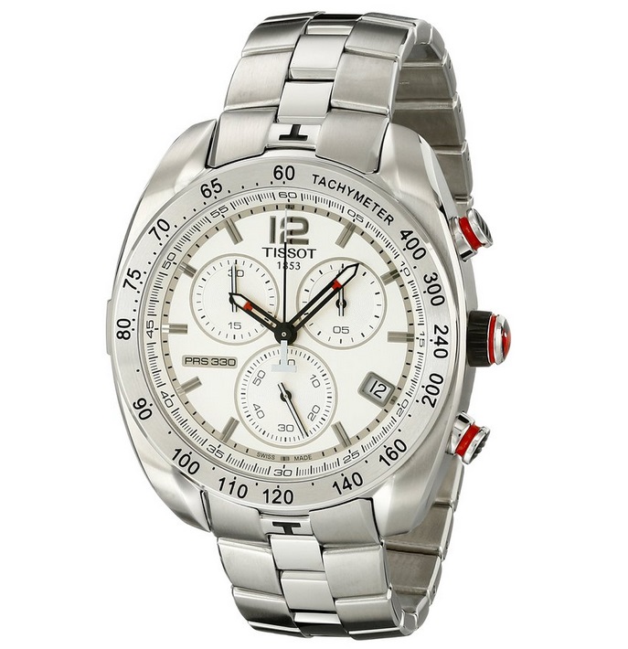 天梭Tissot Men's T0764171103700 Analog Display Quartz Silver Watch 瑞士制造三眼计时精钢男表,这款手表采用银色不锈钢金属表壳以及表带,内置一颗瑞士原产石英机芯,走时精准,基本不会出现时间误差,绝对是你身边最可靠的伙伴。以银色为主体的设计下,在表冠以及分针秒针上点缀了红色,让整款手表显得多了一份动感,经典的三眼计时功能,表盘外圈还带有视距仪功能,4点处有日期功能,12点下方为TISSOT 1853的字样,象征天梭160多年的辉煌历史。带有100米防水的能力,可以戴着游泳以及进行较浅的潜水活动。