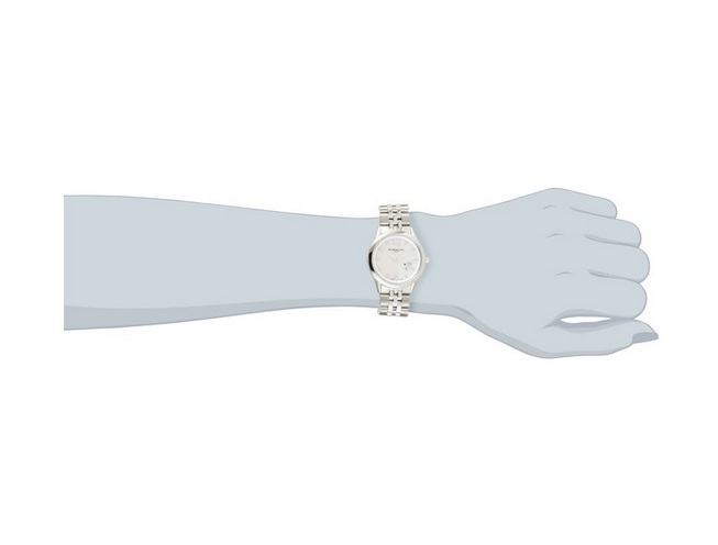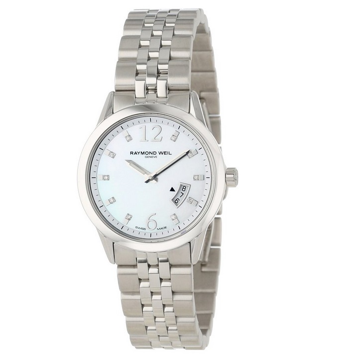雷蒙威Raymond Weil Women's 5670-ST-05985 Freelancer Date Steel Mother-Of-Pearl Dial Watch 自由骑士瑞士珍珠表盘钻石女表,Raymond Weil蕾蒙威是美国中产阶级热衷的手表品牌,其精益求精的制表标准,无论是精密度、品质、可靠度、尊贵的设计和零件的技术,都成为人们认可它的理由。这款5670-ST-05985 雷蒙威女士腕表,内置优质瑞士原装石英机芯,保证了时间的精确,外观采用银色全钢表壳表链设计,沉稳优雅,气质非凡,防滑痕抗反射蓝宝石玻璃表镜下为银色表盘,表盘上镶有银色全时刻度,边缘精确到秒,3点钟方向为日历显示窗口,银色时分秒指针,表盘直径29mm,防水深度100米。