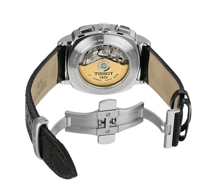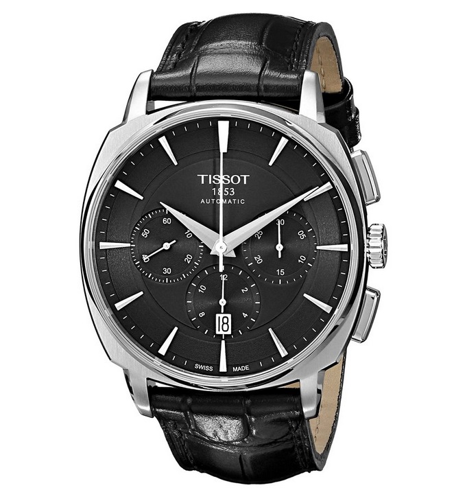 天梭Tissot Men's T0595271605100 T Lord Analog Display Swiss Automatic Black Watch 男士自动机械手表,这款属于天梭的T Lord系列,全新的T-Lord系列并非直接复刻古董表,却采用了六、七十年代腕表的重点设计元素、重新以时尚的设计手法来呈现,黑色皮革表带搭配银色精钢表壳,以及黑色的表盘,看上去酷劲十足。银白色的数字刻度,以及三眼计时功能,做工精湛,带有运动风格。6点处有日期以及星期功能,细节处设计比较精致,12点下方的TISSOT 1853字样象征了天梭品牌160多年的光辉历史,瑞士原产石英机芯带来精确的数字走动,50米防水功能,可以戴着洗澡!