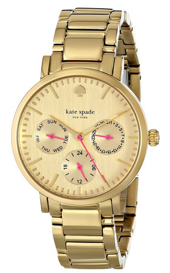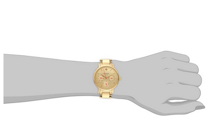 这款kate spade new york 1YRU0469 女士手表,采用日本石英机芯,确保了时间的精准,金色不锈钢表链+金色表盘,通体的金色,给人极度奢华的感觉,特别是在阳光的照耀下,非常抢眼,真正的高大上!内设三个小表盘,搭配粉色指针,独出心裁的设计,个性十足,时尚活泼。12点钟位置点缀品牌logo与品牌名称,彰显出了品牌的魅力。矿物质水晶表镜,能有效放置日常活动带来的刮擦。表壳直径34mm,相对于女表来说,算是表径较大的一款女表,适合手腕稍粗的女士佩戴。需要注意的是这款手表不防水,洗澡时需要脱下以防进水失灵。