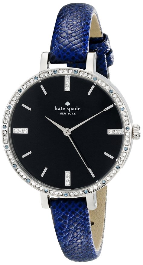 这款kate spade new york 1YRU0587 Metro 女士石英手表,内置精准的日本石英机芯,确保了时间的精准,黑色表盘配与宝蓝色蛇纹表带,深沉大气,4个主要时标与表盘外圈轮廓用水晶装饰,12点处下方为Kate Spade的桃心logo与其名牌字母标志,正下方为kate spade new york的字母logo,彰显品牌魅力,表径34mm,10米生活防水,应付日常生活不在话下。