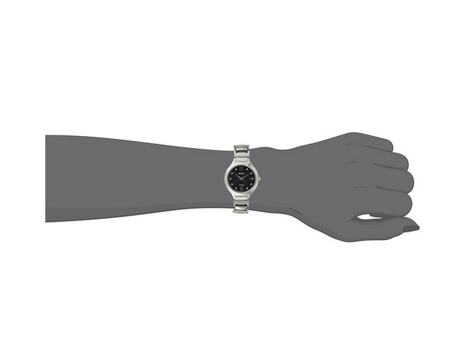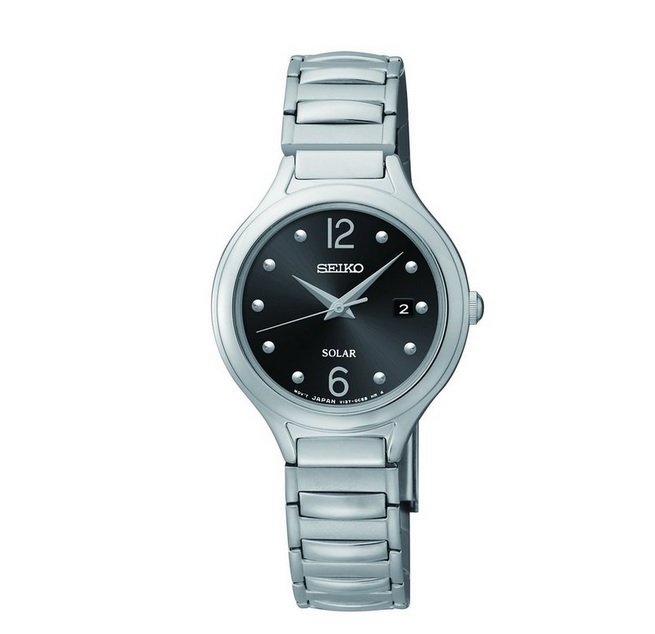 精工Seiko Women's SUT177 Analog Display Japanese Quartz Silver Watch 女士石英手表,这款来自Seiko精工的石英手表,型号为SUT177,这款手表使用太阳能驱动,在任何可见光下都可自行充电,无需更换电池。充满电后可运行6个月!黑色表盘搭配不锈钢表壳和表带,表盘上除了6和12点位置之外,其他位置都采用了珍珠圆点标识刻度,让整款手表看上去十分典雅端庄!3点钟位置显示日历日期,表盘直径27.8mm,厚7mm,表带宽12mm,属于比较纤细轻薄的款式,适合多数女士的手腕,防水50米,可以戴着游泳!