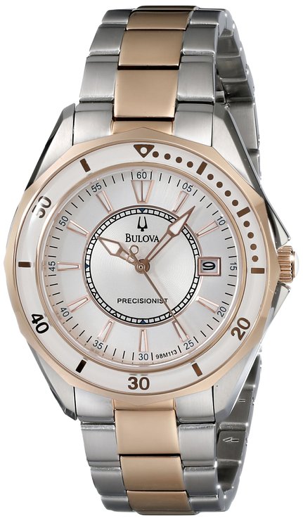 这款Bulova 宝路华98M113 玫瑰金石英女表 ,采用玫瑰金装饰白色表盘,银色不锈钢间金表带,矿物水晶玻璃表镜,防刮耐磨,表盘直径36mm,厚度10mm,在女表中算是表盘比较大的,3 点位置显示日期,内置日本石英机芯,确保了时间的精准,值得一提的是防水达到100米还是很靠谱的,适合浮潜,游泳,但不是潜水,应付日常生活不在话下。