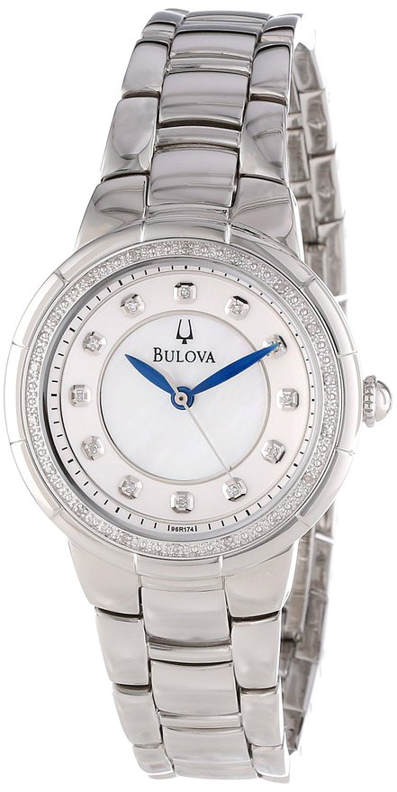这款Bulova 宝路华96R174 镶钻时尚女表 ,属于宝路华Rosedale系列,这款钻表型号为96R174,采用石英机芯,确保了时间的精准,白色珍珠贝母表盘上镶有12颗白钻时标,搭配文艺蓝钢指针简约耐看,表圈上镶嵌18颗碎钻也够闪瞎眼。表盘直径为33mm,厚度10mm,银色不锈钢表带和表壳,矿物水晶表镜,30米生活防水,足够应付日常生活。