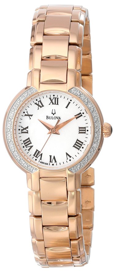 Bulova 98R156 Classic Round Diamond Accented Watch 宝路华玫瑰金珍珠贝母表盘镶钻女表,内置石英机芯,确保了时间的精准。玫瑰金色的表身加上珍珠贝母表盘、配合一圈的镶钻非常绚丽,矿物水晶玻璃表镜,防刮耐磨,30米防水等级,经受雨水和飞溅的水,但不是淋浴或浸,应付日常生活不在话下,28mm的表盘尺寸妹子也能轻松hold住。