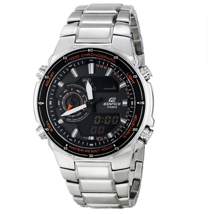 卡西欧Casio Men's EFA-131D-1A4VCF Edifice Analog-Digital Silver-Tone Stainless Steel Watch 男士防水防泥防震数码运动手表,这款Casio的EFA-131D-1A4VCF男士腕表,属于EDIFICE系列,设计灵感上来自超跑,将急速与动力很好的体现,凸显男士雷厉风行与果敢的气质。便攀上为双显示指针加数字的设计,彩色液晶表面分上下LED时间显示,分别显示时间与日期,可以分别看指针计时或数字计时,使用上更加方便。搭载1/1000的秒表与左侧的速度指示器,模拟汽车的仪表盘,动感十足;100米的防水功能,世界时间和五组闹铃功能,动感十足。而不锈钢表链的设计中和了运动和时尚,也方便日常也可以配方。表盘宽度46mm,厚13mm。