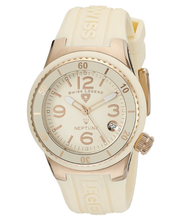 瑞士传奇Swiss Legend Women's 11840P-RG-016 Neptune Beige Dial Beige Silicone Watch 女士石英手表,SWISS LEGEND瑞士传奇是一个与众不同的品牌,它是动态的、现代的、活生生的。他的设计理念的核心部分在于我们和谐地平衡尖端技术与传统精准的时尚、独特的钟表风格承诺。如同展示给我们看的这款手表一样,淡金色表带与表盘的搭配,部分地方为金色,比如刻度等处,整款手表看上去就显得整洁有致,又不乏高贵典雅,4点处有日历功能,12点下方为Swiss Legend瑞士传奇字样,还具有100米的防水功能,内置一颗瑞士原产石英机芯!
