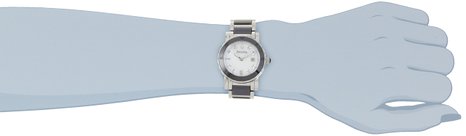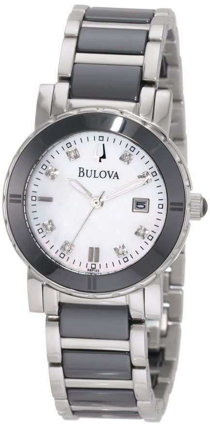 这款Bulova 宝路华 98P122 珍珠母贝镶钻 陶瓷表圈女士腕表,采用珍珠贝母表盘,时间标刻由8颗钻石和银色金属组成,上去更加高贵典雅,富有韵味。3指针形式,带夜光,方便夜间读取,3点钟日历显示,黑色陶瓷表圈,银色表壳,表盘直径30mm,厚度8mm,表带为银色不锈钢搭配黑色陶瓷,内置日本石英机芯确保了时间的精准,30米生活防水,足够应付日常生活。