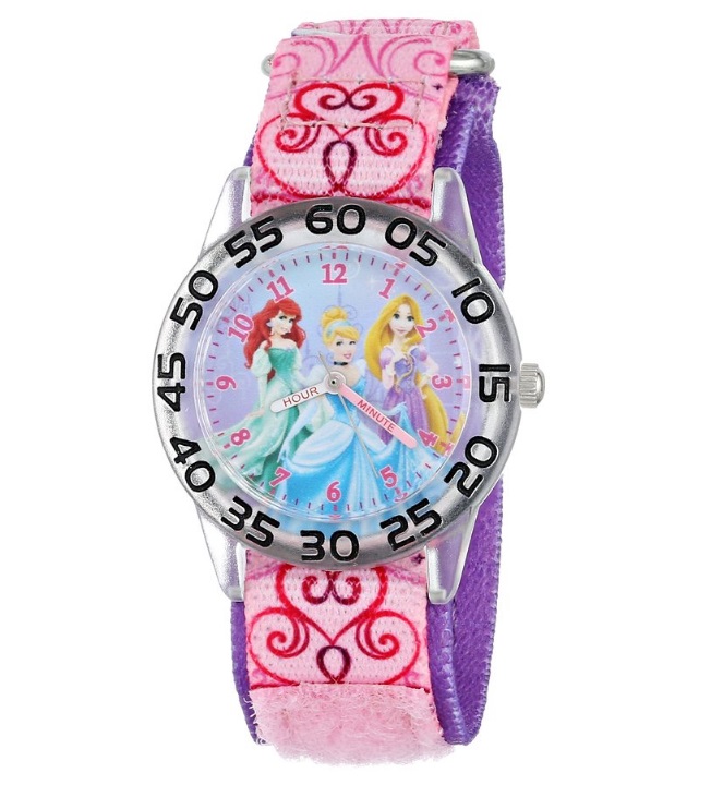 迪士尼Disney Kids' W001192 Time Teacher Princess Watch with Pink Nylon Band 小女孩公主手表,这是一款相当可爱的手表,表盘上印着三位公主的图案,分别是来自《美人鱼》的爱丽儿公主,来自《灰姑娘》的仙度瑞拉,还有来自《长发公主》的乐佩,适合送给3-7岁的小姑娘戴,表面设计除了公主印花图案之外就比较简单了,仅采用了数字刻度,不过分针和时针上贴心地标识了HOUR和MINUTE,方便小朋友区分分针和时针,表带与表壳都是塑料材质的,表带上有各种印花图案,还带有30米防水,内置了一颗石英机芯!