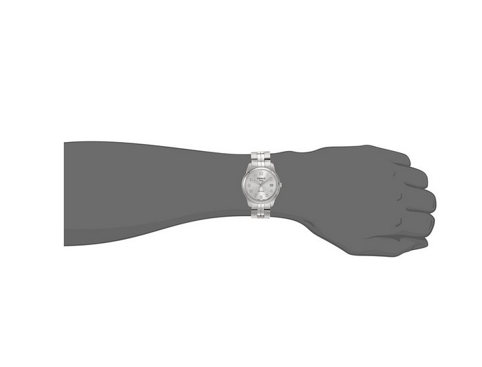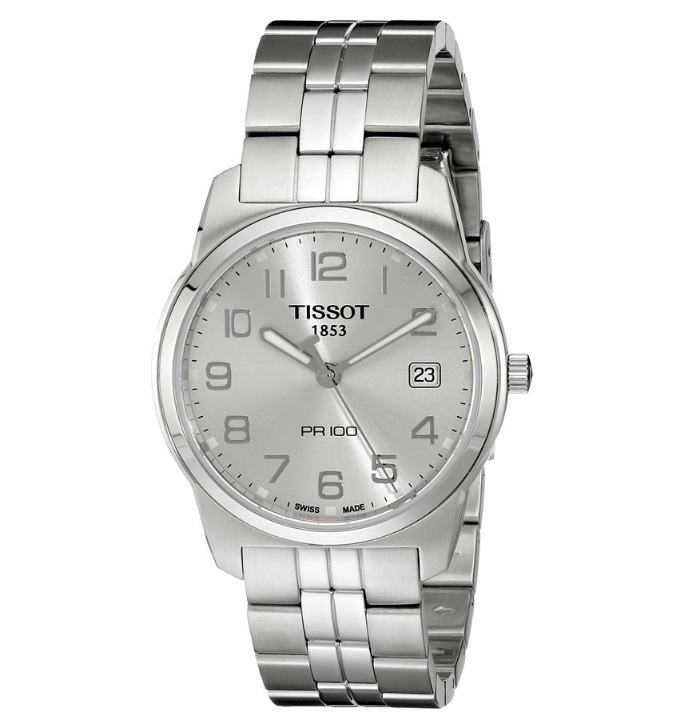 天梭Tissot Men's T0494101103201 PR 100 Silver Dial Bracelet Watch 瑞士制造银盘银针型男腕表,属天梭银盘手镯款式表,命名中就有Bracelet手镯这个词,款式上也更偏向于装饰性。内置一颗精准的瑞士原产石英机芯,基本不会出现时间偏差。防眩蓝宝石水晶表镜坚固耐用,3点处日历显示,深灰色阿拉伯数字标时,灰色表针,带有夜光功能,没有其他多余的装饰,配色简单清爽。银色不锈钢表壳和精钢表链,富有银色金属特有的光泽度,看上去沉稳低调,不会太过耀眼,但又有自己的光芒在其中。表壳直径38毫米,防水100米,可以满足日常生活中基本的防水需要,戴着游泳毫无压力,设计传统简约,优雅大气!