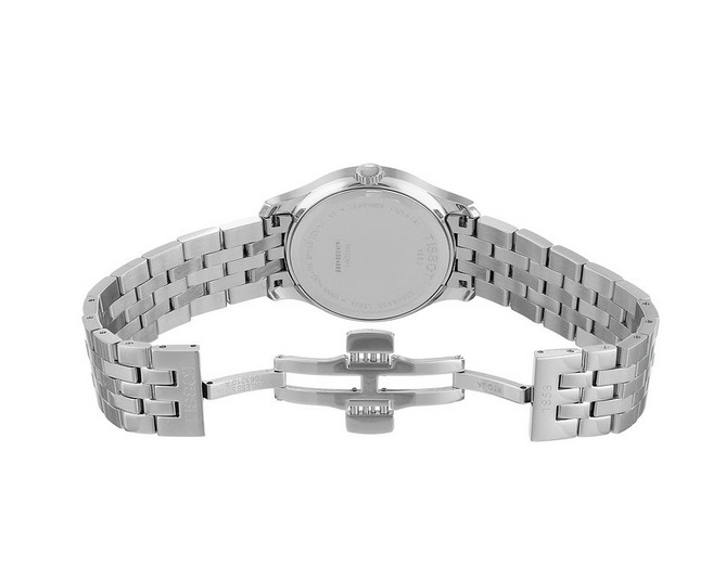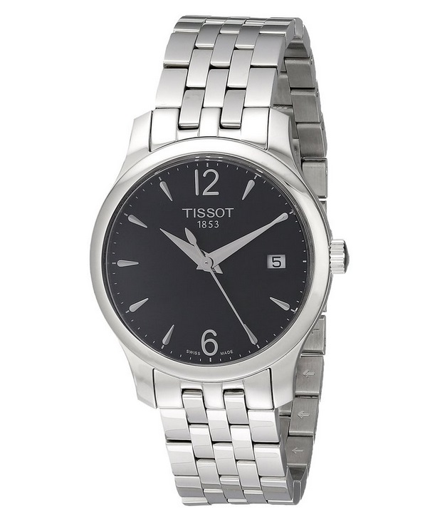 天梭Tissot Women's T0632101105700 T-Trend Analog Display Quartz Silver Watch 女款不锈钢手表,经典的精钢表带,金属光泽、配以摩登感十足的表盘设计,低调、时尚、大气,受到无数商务人士的青睐。采用瑞士石英机芯,保证精准走时,银色不锈钢表壳与表带,散发经典的金属光泽,而且颇具质感,防滑水晶镜面,12点下方有TISSOT 1853的字样,象征了天梭一百六十多年的底蕴,3点处带有日历窗口,沉稳低调的黑色表盘搭配冷峻内敛的银色指针,简约不俗气,绝对是都市时尚女性必备的手表款式。表宽33MM适合女士使用,防水深度30M。