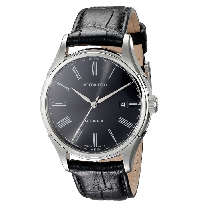 汉密尔顿Hamilton Men's H39515734 Timeless Class Analog Display Automatic Self Wind Black Watch 典藏时光瑞士自动机械男表,此款男士腕表属于汉密尔顿经典的典藏时光系列,延续了典藏时光系列的经典造型,外观典雅而大气。日期窗口与多数手表一样放到了3点位置。采用经典的瑞士自动上链机械机芯,防划防眩蓝宝石水晶表镜,不锈钢表壳,表壳直径40mm,适合多数男士的手腕粗细,黑色表盘配银白色小时及分针,再加上黑色小牛皮表带,防水50米,可以戴着洗澡。整体设计华丽低调,简约大气,无可挑剔,非常棒的一款机械腕表!
