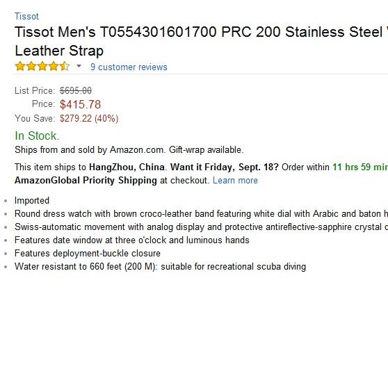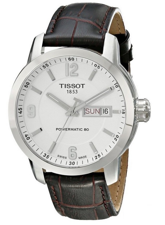 天梭Tissot Men's T0554301601700 PRC 200 Stainless Steel Watch with Brown Leather Strap 瑞士自动机械背透男士腕表,内置一颗瑞士自动机械机芯,非常高端,银白色表盘,设计简洁,在3点处有日历功能,棕色皮革表带,纹路清晰,质感很不错!在非常时髦的制表工艺中点缀了恰当的怀旧元素,给尖端的现代工艺穿上了一件复古设计的外套。高科技的腕表运转工艺被经典的设计细节和微妙的复古装饰所平衡。同时,精妙的扭锁状装饰和曲线简洁的表壳进一步提升了整体的经典感觉。天梭俊雅系列向每一位佩戴者保证了美观且精准实用的佩戴享受。