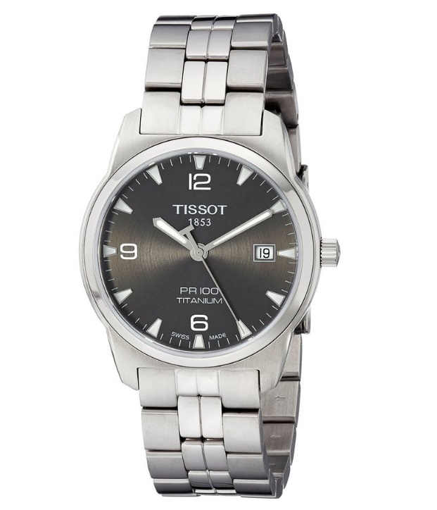 天梭Tissot Men's T049.410.44.067.00 Anthracite Dial PR 100 Watch 瑞士制造钛金属男士石英腕表,内置一颗瑞士ETA F06.111 石英机芯,振频为每小时32768次,保证了走时的精准。采用了钛金属表带以及表壳,独有的银灰色金属光泽,不仅轻质,而且硬度高,耐磨损,耐腐蚀性能出色。采用蓝宝石水晶玻璃镜面,防刮耐磨。38mm表径,适合手腕比较细的男士佩戴,黑色表壳搭配银白色指针和刻度,12点下方有TISSOT 1853的字样,象征了天梭一百六十多年的底蕴,3点处带有日历计时,100米防水,可以戴着游泳喔!