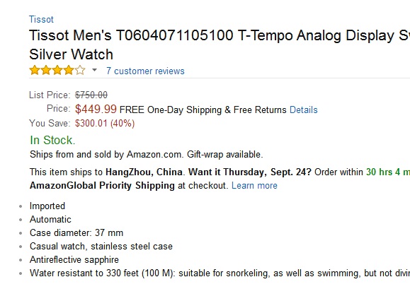 美国亚马逊$449.99(到手约¥2940)历史新低价格,属于天梭中高端的机械手表了,各方面配置都很不错,同款淘宝代购价格在4000元左右,还是自己海淘吧!
