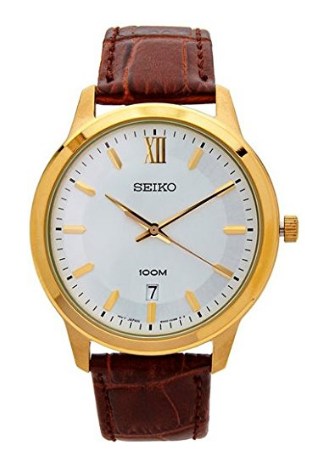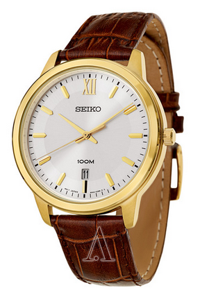 Seiko 精工 SUR046 男士镀金石英手表,采用不锈钢镀黄金外壳,符合中国审美的土豪金配色,银色表盘又显得非常纯净美好,银色底盘搭配金色指针和金色刻度盘与外壳呼应,洋气十足,日本石英机芯供电,性能很不错。12点下方有Seiko字样,彰显品牌魅力,6点处带有星期窗口,方便实用。矿物晶石表壳,提供了良好的防划性能,长时间佩戴也不容易刮花。直径约42mm,厚度8mm,绝大部分男士都能轻松驾驭。手表带有100m的防水功能,任何日常生活使用都不在话下。棕色织纹式小牛皮表带,与表盘很搭,整体外观大气而不张扬,走时准确、功能实用,非常适合工作场合佩戴,精品男士不要错过哦!