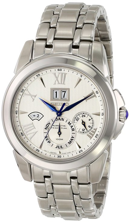 这款Seiko精工SNP065 Kinetic 人动电能男士正装手表,采用精工特有的Kinetic人动电能专利技术,原理类似自动机械机芯的能量存储,区别在于Kinetic是把手腕摆动的动能转换为电力。Kinetic机芯的手表日常佩戴即可给表内电池充电,充满后可独立运行6个月。不锈钢表壳和表带,象牙色表盘,蓝色指针,罗马数字小时刻度,阿拉伯数字分针和秒针刻度,在12点位置显示日历。适合正式场合。两个小表盘,一个显示月份一个显示小时(24小时格式)。在9点钟位置显示是否闰年。防刻画蓝宝石玻璃。直径44毫米,厚14毫米。100米防水!