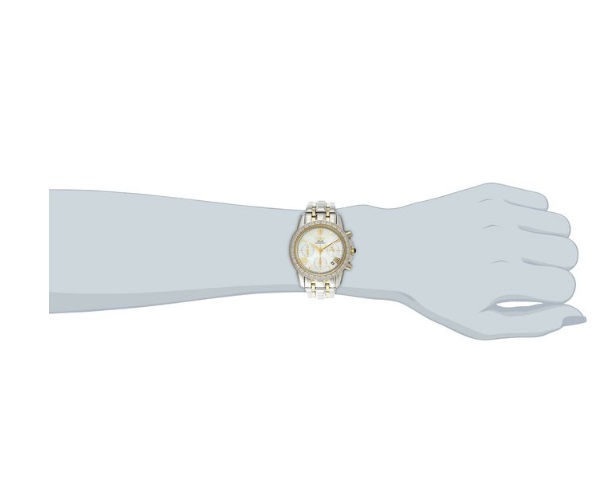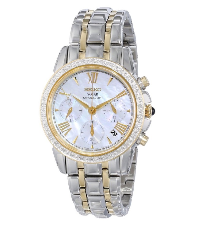 精工Seiko Women's SSC892 Diamond-Accented Two-Tone Stainless Steel Watch 女款石英手表,这款手表采用太阳能石英机芯,在任何可见光下都可充电,无需更换电池,一般寿命都在10年左右!整体上采用金色和银色双色调。加上珍珠贝母表盘,表壳外圈装饰有30颗钻石。显得十分珍贵典雅。不锈钢表壳和表带。防划痕Hardlex表镜。三眼式款式,具计时功能。三个小表盘分别显示小时、分钟和秒钟。在四点和五点之间显示日历。表盘直径35.5mm,适合大多数的MM戴着。防水100米,可以戴着洗澡、游泳,日常生活防水毫无压力。