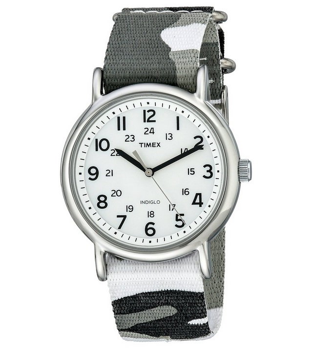 天美时Timex Unisex T2P366 Weekender Gray Camo Slip-Thru Nylon Strap Watch 尼龙表带男士手表,本款手表是一款外形相当出色的时装表,内置精确石英机芯,外观采用淡色迷彩尼龙表带搭配银色不锈钢表壳,经典优雅,气质非凡,看上去颇具质感,让整款表的外观都提升了一个档次,防刮耐磨矿物玻璃表镜下为白色表盘,表盘镶有阿拉伯数字刻度,边缘精确到秒,内圈为24小时计时的刻度,黑色时分指针,银色秒针,表盘直径38mm,比较纤细小巧,符合时装手表的定位,防水深度30m,可以应付日常生活中的溅水等情况。