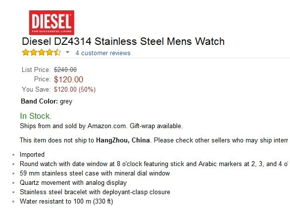 金属工业!迪赛Diesel DZ4314 超酷男士手表 $120(到手约¥840)