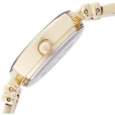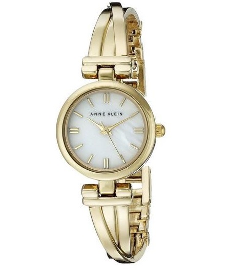 安妮克莱因Anne Klein Women's AK/1170MPGB Bangle Watch 女士时装休闲石英手表,一款外观十分时尚个性的女士手表,金色的金属材质表带搭配同样是金色色的表壳,让整款手表看上去就像一个亮闪闪的金色手镯一样,时尚夺目。表盘直径为24mm,属于比较纤细的款,表盘厚度7mm,比较纤薄,不到1cm的厚度,内置一颗日本产的石英机芯,走势比较精准,基本不会出现较大的时间误差,表盘采用了珍珠母白配色,与金色的指针以及刻度搭配,相当和谐,另外还有30米的生活防水,应付日常生活中的溅水、下雨之类的毫无压力!