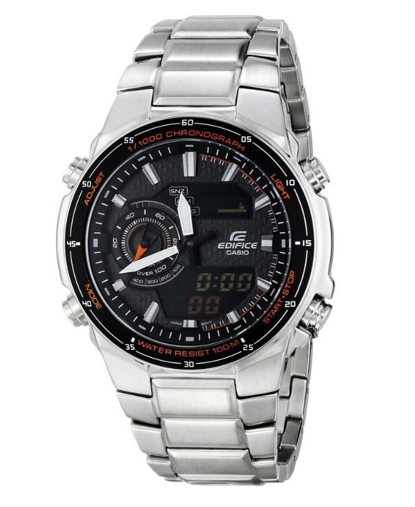 卡西欧Casio Men's EFA-131D-1A4VCF Edifice Analog-Digital Silver-Tone Stainless Steel Watch 男士防水防泥防震数码运动手表,这款Casio的EFA-131D-1A4VCF男士腕表,属于EDIFICE系列,设计灵感上来自超跑,将急速与动力很好的体现,凸显男士雷厉风行与果敢的气质。便攀上为双显示指针加数字的设计,彩色液晶表面分上下LED时间显示,分别显示时间与日期,可以分别看指针计时或数字计时,使用上更加方便。搭载1/1000的秒表与左侧的速度指示器,模拟汽车的仪表盘,动感十足;100米的防水功能,世界时间和五组闹铃功能,动感十足。而不锈钢表链的设计中和了运动和时尚,也方便日常也可以配方。表盘宽度46mm,厚13mm。