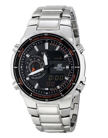 卡西欧Casio Men's EFA-131D-1A4VCF Edifice Analog-Digital Silver-Tone Stainless Steel Watch 男士防水防泥防震数码运动手表,这款Casio的EFA-131D-1A4VCF男士腕表,属于EDIFICE系列,设计灵感上来自超跑,将急速与动力很好的体现,凸显男士雷厉风行与果敢的气质。便攀上为双显示指针加数字的设计,彩色液晶表面分上下LED时间显示,分别显示时间与日期,可以分别看指针计时或数字计时,使用上更加方便。搭载1/1000的秒表与左侧的速度指示器,模拟汽车的仪表盘,动感十足;100米的防水功能,世界时间和五组闹铃功能,动感十足。而不锈钢表链的设计中和了运动和时尚,也方便日常也可以配方。表盘宽度46mm,厚13mm。