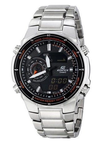 卡西欧Casio Men's EFA-131D-1A4VCF Edifice Analog-Digital Silver-Tone Stainless Steel Watch 男士防水防泥防震数码运动手表,这款Casio的EFA-131D-1A4VCF男士腕表,属于EDIFICE系列,设计灵感上来自超跑,将急速与动力很好的体现,凸显男士雷厉风行与果敢的气质。便攀上为双显示指针加数字的设计,彩色液晶表面分上下LED时间显示,分别显示时间与日期,可以分别看指针计时或数字计时,使用上更加方便。搭载1/1000的秒表与左侧的速度指示器,模拟汽车的仪表盘,动感十足;100米的防水功能,世界时间和五组闹铃功能,动感十足。而不锈钢表链的设计中和了运动和时尚,也方便日常也可以配方。表盘宽度46mm,厚13mm。