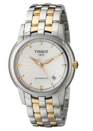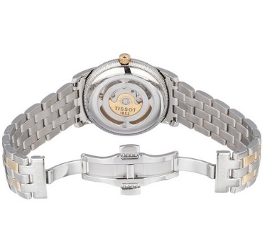 天梭 Tissot Men's T97248331 T-Ring Two-Tone Bracelet Watch 经典系列自动机械男士腕表,这款来自天梭的机械手表,外观采用了银色精钢表壳表带的设计,表带中间嵌有金色,与表冠等处相得益彰,总体适合型男,内置一颗瑞士自动机械机芯,背透设计,可以看到内部机械零件的精密运转,41mm表径,这个大小对于一款正装手表来说是最为合适的,不会破坏西服袖口的整体美感。表盘上金色的指针与刻度相当有格调,带来浓浓的复古感觉,4点与5点中间有日期功能,同时带有30米的生活防水,总体而言很不错!