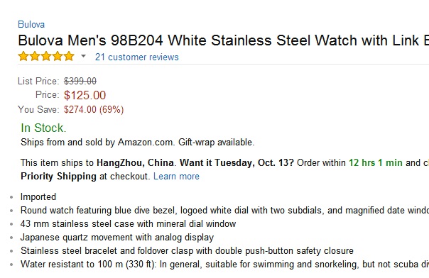 宝路华 Bulova Men's 98B204 White Stainless Steel Watch with Link Bracelet 白盘蓝针海洋之星三眼计时男士腕表,这款来自宝路华的手表内置一颗日本原产的石英机芯,走时精准,基本不会出现时间误差,外观上非常时尚,银色不锈钢金属表带,白色表盘,搭配蓝色表壳,如同海洋之星一般,文艺气质范儿十足,三眼计时,而且巧妙地作了设计,4、5点中间有日期功能,12点下方的BULOVA字母彰显了品牌魅力,下方的标志表示这款手表具有100米防水的功能,可以戴着游泳、洗澡,43mm表径,10.5mm厚度,大小适中,适合多数男士!