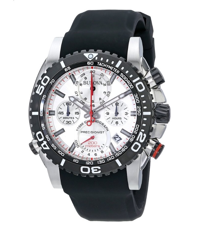 宝路华 Bulova Men's 98B210 Analog Display Japanese Quartz Black Watch 男士四眼计时测速防水石英表,从外形上就能看出这款来自宝路华的手表的与众不同,极富运动气息的款式设计,表盘外圈的视距仪功能非常实用,同时给人一种精密的数字参数感觉。内置一颗石英机芯,走时精准,基本不会出现时间误差,采用先进的Precisionist技术,彰显时尚前卫的风格。世界上首款手表结合了1/1,000秒计时、每年十秒误差精度和十二小时计时,单一表盘上一切尽可一览无余,集精确度、准确性和时尚于一体。这款手表是无与伦比的视觉设计杰作,具有经典的细节和卓而不凡的技术。另外还具有200米防水功能。