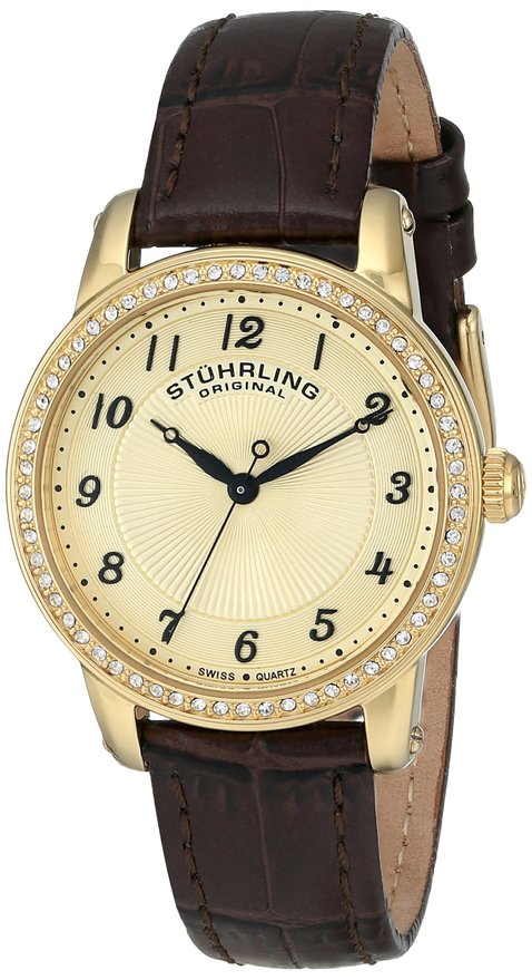 这款Stuhrling Original 651.02 斯图灵经典女士手表,内置瑞士石英机芯,确保了时间的精准,外观采用深褐色真皮表带搭配金色不锈钢表壳,表框周围镶有一圈施华洛世奇元素水晶,闪耀奢华;黑色阿拉伯数字时刻和指针,还有一种古典风情有木有;经典不失高贵,既展现现代文化,又传承了古老的钟表工艺,表径34毫米,防水深度50米还是很靠谱的。