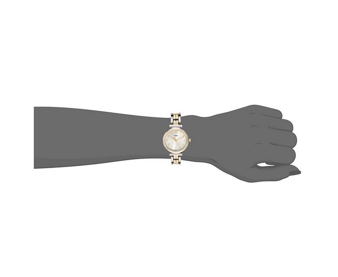 天美时 Timex Women's T2P2019J Elevated Classics Dress Two-Tone Bracelet Watch 女款双色时尚石英手表,采用石英机芯,时尚的银色和金色相间的表带设计简约大气,不管身处何方都是众人中的焦点!银色表壳采用金属材料,结实耐用,外加白色表盘上金色指针和数字,显得时尚精致,能够为佩戴者增色不少,数字刻度作了复古字体处理,细细的指针与数字刻度搭配相当合适。外壳直径28毫米,厚度7毫米,属于超薄系列,11毫米宽度的不锈钢表带配带舒适,适合手腕较细的女生佩戴。30米防水足够日常使用,平时用来计时和日常搭配还是很不错的。