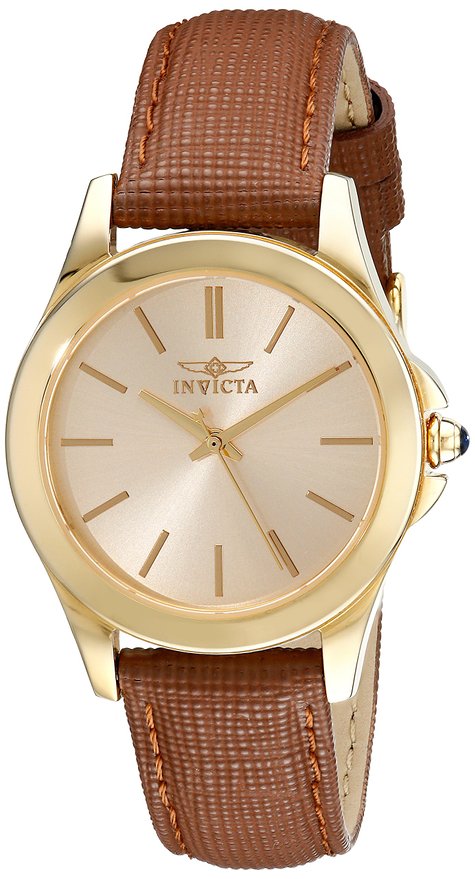 这款Invicta 别克展望15150 "Angel" 女士石英手表,内置精确日本石英机芯,确保了时间的精准,外观采用褐色真皮表带搭配金色不锈钢表壳设计,简约时尚,防刮耐磨矿物玻璃表镜下为金色表盘,表盘上镶有金色全时刻度,搭配金色时分秒指针,表盘直径32mm,防水深度30m,足够应付日常生活。