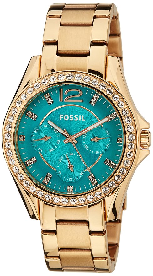 这款Fossil ES3385 化石女士Riley Multifunction石英手表,内置优质石英机芯,保证时间的精确,外观采用玫瑰金不锈钢表壳表带设计,表框周围镶嵌水晶,晶莹剔透,奢华闪耀,防刮耐磨矿物玻璃表镜下为海蓝色表盘,表盘镶有水晶刻度,三眼日历副表盘,夜光指针方便夜间读取,表盘直径38mm,防水深度100m还是很靠谱的,应付日常生活不在话下。