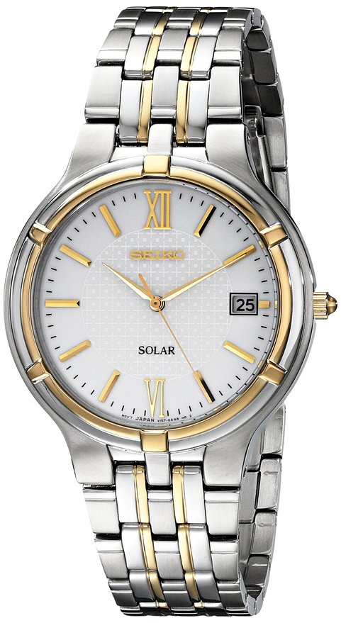这款精工seiko Men's SNE066 Dress Solar Watch男士太阳能手表,采用Solar光动能机芯,所有类型光均可提供动力,无需更换电池。采用日本石英机芯,Hardlex钢化玻璃表面,简洁的白色表盘,搭配金银相间色调,彰显成熟稳重风格,配色更加漂亮,质感更加出色。不锈钢表壳、不锈钢表带。很显气度与大气。表壳直径37mm,表壳厚度10mm,30米防水。一个华丽的手表肯定能搞高你地位,无论是正式或休闲场合.经久耐用。