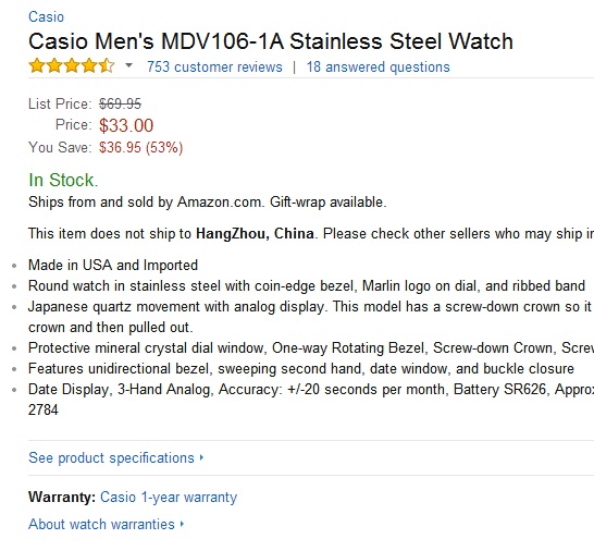 可潜水!卡西欧 Casio MDV106-1A 男款石英手表 $33(到手约¥270)