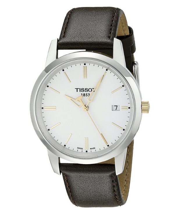 天梭 Tissot Men's TIST0334102601100 Class Dream White Dial Watch梦想典藏瑞士制造男款真皮腕表,此款天梭男式手表采用38mm不锈钢表壳,冷峻的银白色调抛光不锈钢表壳,蓝宝石水晶玻璃表面,耐磨防刮性能一流,日常使用很难出现磨损,白色表盘配以淡金色的小时刻度,经典的淡金色指针设计,黑色真皮表带,皮革纹路质感丰富,而且显得相当高档时尚,尽显天梭经典表的优雅与大气,配合走时精确的瑞士石英机芯,是不错的正装配表。30米/ 99英尺的防水,适合日常生活防水,可以防止生活中的溅水、下雨等情况!