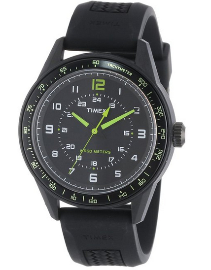 天美时 Timex Men's T2P024KW Ameritus Sport Watch with Black Band 男士运动手表,这款黑色运动手表,能尽显运动男儿风采。采用42毫米的黑色不锈钢表壳和黑色硅胶带,黑色表盘和绿色的指针点缀,简单大方。24小时显示,表圈设计为测速计,三点钟方向有日历显示,。整体设计简约清新,使得这款手表既是一个时尚的配件,又是一款实用的计时工具。内置精确石英机芯,走时精准,基本不会出现时间误差,这款手表防水50米,可以应付日常生活中的溅水等情况,还可以戴着洗澡,方便实用,看上去颇具质感!