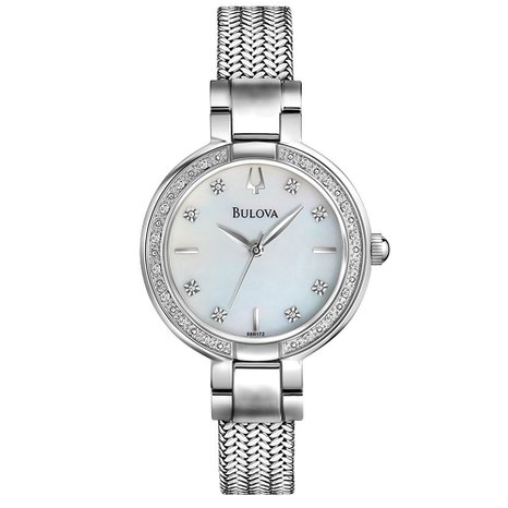 这款Bulova 宝路华 96R177 时尚女表,内置石英机芯,确保了时间的精准,白色珍珠贝母表盘,表圈上镶有24颗闪耀夺目的天然真钻,天然真钻时标,矿物水晶表镜,表盘直径为29mm,防水99英尺(30米):经受雨水和飞溅的水,但不洗澡或淹没,足够应付日常生活,厚度仅6.8mm,非常纤薄,搭配比较少见的编制不锈钢表带,设计非常简约,上手小女人气息满满!