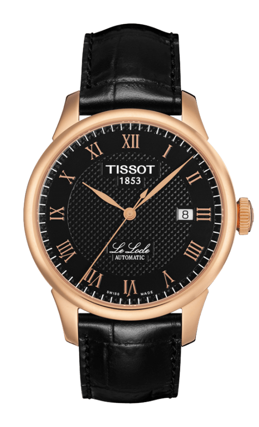天梭 Tissot Le Locle Automatic Black Dial Mens Watch T41542353 力洛克瑞士自动机械玫瑰金男表,力洛克是成功的代名词。力洛克是天梭位于瑞士侏罗山的总部所在地名称,同时也是备受青睐的一款自动表系列的家族名称。该系列手表以细致入微的细节处理(例如罗马数字和传统力洛克标志形成了典雅的造型)充分展现了优雅的设计。无论白天还是夜晚,都令您散发迷人魅力。具体到这款手表,玫瑰金表壳、指针刻度搭配黑色皮革表带与黑色表盘,3点处有日期功能,内置一颗自动机械机芯,39.3mm表径,还有30米的防水!