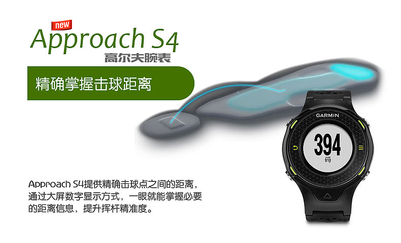 佳明 Garmin Approach S4 GPS Golf Watch 智能内置高尔夫教程GPS手表,对于高尔夫爱好者来说,他们需要能够帮助自己的智能穿戴设备。这是一款具有GPS功能的腕表,它提供了与前代产品许多相同的功能,除此之外,在这一版本中,还加入了许多新的功能与特性。在新款Approach S4中,屏幕分辨率变得更高,电池容量也提升到了一次充电可以使用10个小时,另外,手表中存储了教学数据,包含超过30,000个国际高尔夫教程(S3的课程数量为27,000个)。除此之外,Garmin还为新款手表添加了智能通知功能,用户可以通过手表获得邮件、短信息等消息的通知。