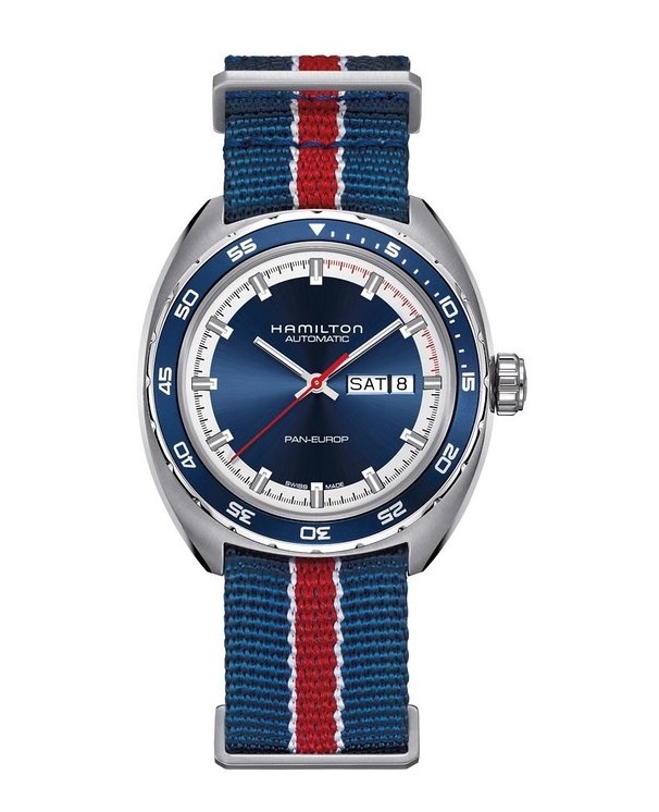 汉密尔顿 Hamilton Timeless Classic Pan Europ H35405741 美国永恒经典系列男士自动机械手表,搭载全新高性能自动上链机芯的泛欧系列腕表。拥有超过3天动力储存的H30自主机芯,与个性动感的造型设计完美融合,向1971年问世的首款泛欧腕表致敬,这款里程碑式的原作装配了史上最早期的自动上链计时机芯。无论是外出度假,或是一展运动才能,泛欧腕表都将成为您绝佳的选择。现代材质和个性颜色将拥有四十多年历史的泛欧装扮成抢眼的摩登腕表。圆形盘面与表耳连为一体,其上的旋转外圈配有铝质刻度圈。抢眼的色调为泛欧画龙点睛,表盘上的白色刻度圈和夜光指针,让时间醒目易读。12点至3点的刻度及秒针采用的激情的红色,仿若赛车速度表。腕表有两种表带可以选择:红白黑或红白蓝相间的NATO合成材质表带,以及穿孔的黑色牛皮表带。星期和日历在表盘的3点钟位置显示。