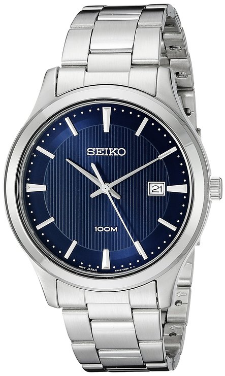 这款Seiko SUR049 精工男士全钢石英手表,内置精确日本石英机芯,保证了时间的精确,外观采用银色全钢表壳表链设计,沉稳优雅,气质非凡,防刮耐磨矿物玻璃表镜下为宝石蓝表盘,表盘镶有银色全时刻度,边缘精确到秒,3点钟方向为日历显示窗,银色时分秒指针,表盘直径41.5mm,防水深度100m还是很靠谱的,足够应付日常生活。