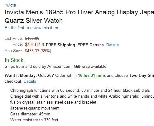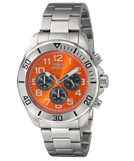 这款因维克塔Invicta Men's 18955 Pro Diver Analog Display Japanese Quartz Silver Watch 男款三眼计时石英手表,经典橘黄,时尚亮丽!超耐磨晶体表镜搭配橘黄色表盘充满年轻的活力;不锈钢表壳和表链;精美耐用,实用性超好。具体配置方面内部搭载了一颗日本原产的石英机芯,走时精准,基本不会出现时间误差,银色不锈钢表壳,搭配橘黄表盘,表盘外圈黑刻度,有一种年轻的感觉,带给人能量的气息,100米防水,三眼计时,Invicta自己制造机壳与零件,在日本组装,凭藉着一流的管理,制造出品质一流、坚固耐用,却又价格合理的手表。